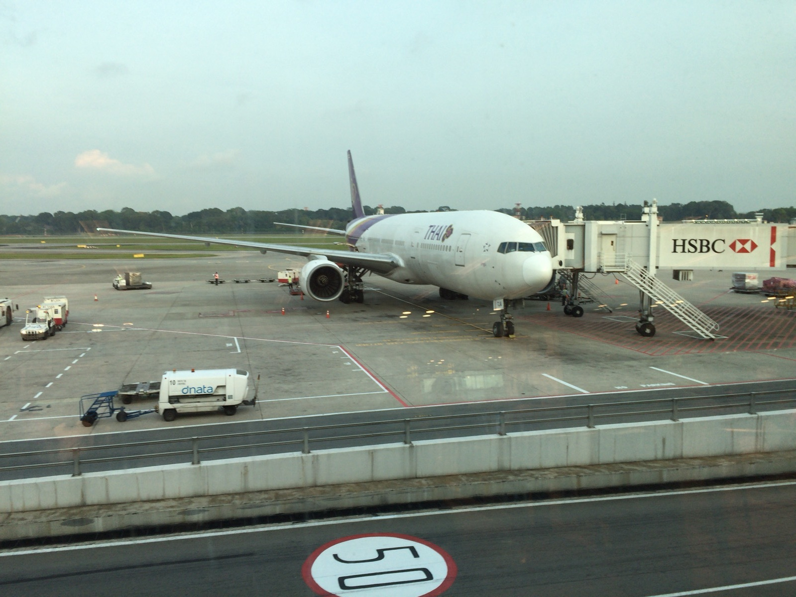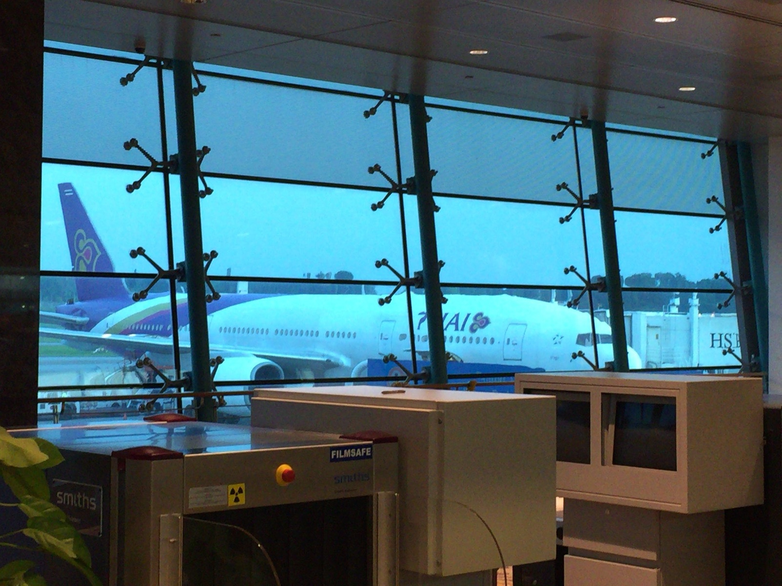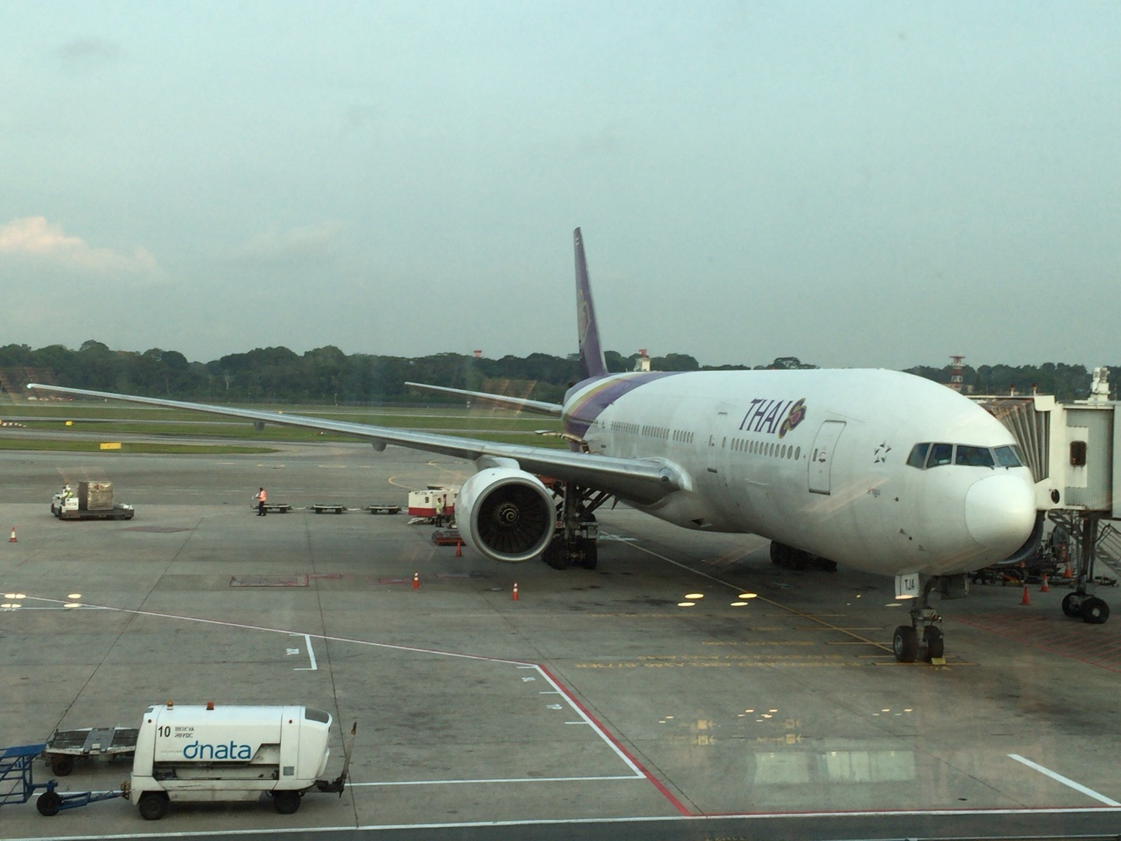 シンガポール航空のメイン空港のチャンギ空港は、シンガポール航空の飛行機だらけです。そんな中、タイ国際航空の飛行機は目を引きます。